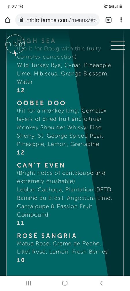 The menu boasts an array of enticing dishes, such as truffle fries and artichoke and crab dip, designed to please any palate. Vegetarian and vegan options are plentiful, ensuring inclusivity for diverse dietary preferences. Cocktails like Afterthot and Oaxacan on Sunshine elevate the dining experience, while brunch delights like the M.Bird Mimosa Flight bring a refreshing twist.